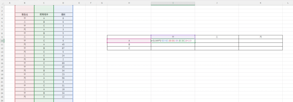 SUMIFS関数を知らない人には訳の分からない関数ですが、要は甲とAが交差する場所(I10セル)に「A社に対して甲商品を何個売ったのか?」を集計している訳です。