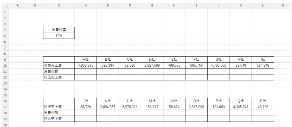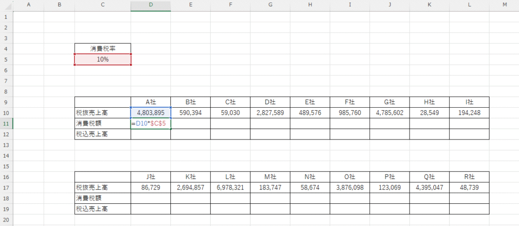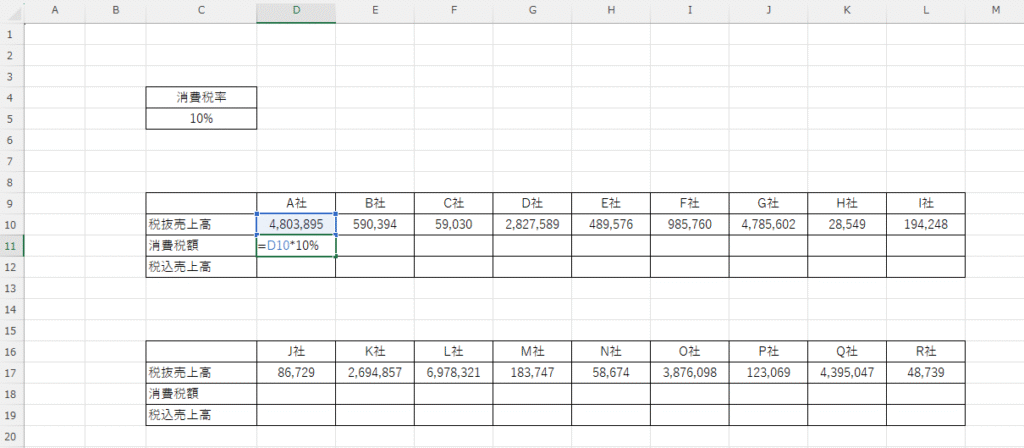 この計算式を残りのB社からR社までひとつずつ組んでいくという方法があります。また、D11セルの計算式をB社からR社までの消費税額の欄にコピーして計算式を組むことも可能です。