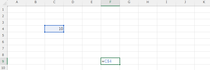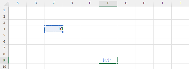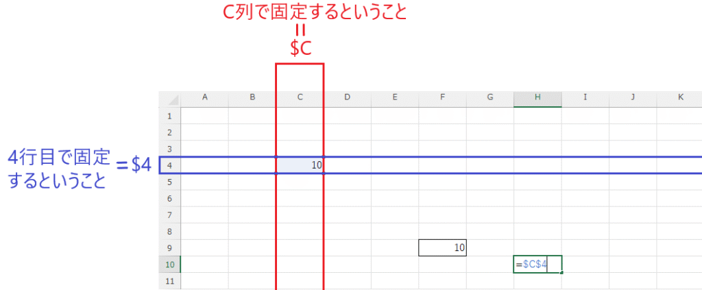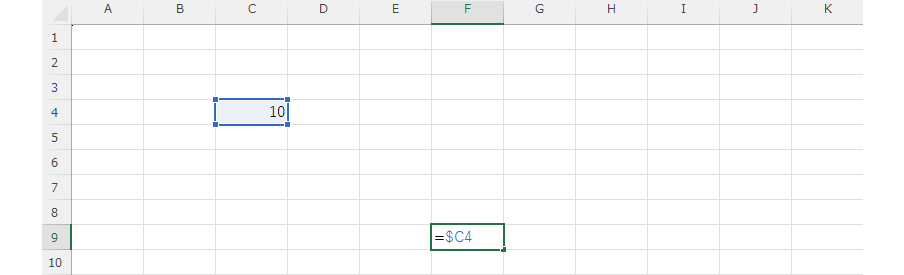 たとえば「C4セル」に「10」という値を入れます。そして「F9セル」が「C4セル」を列固定で参照します。
