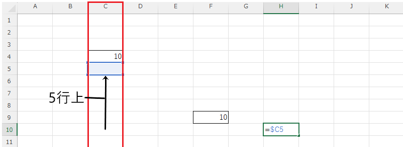 つまり「H10セル」から見て「列は必ずC列を参照し、行は自分の位置から5行上を参照する」ので、「C5セル」を参照することになります。