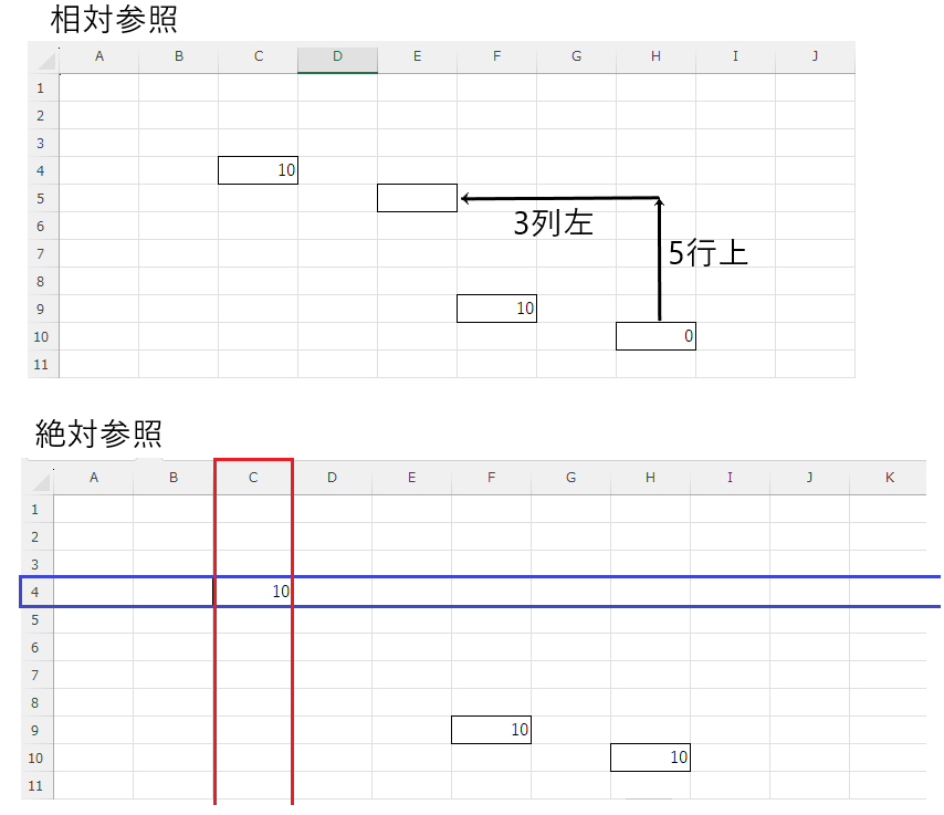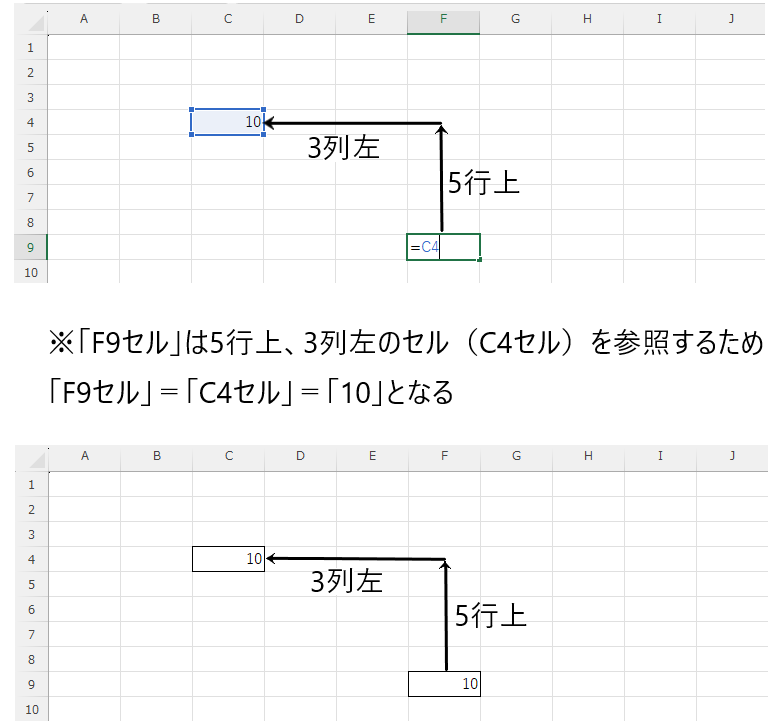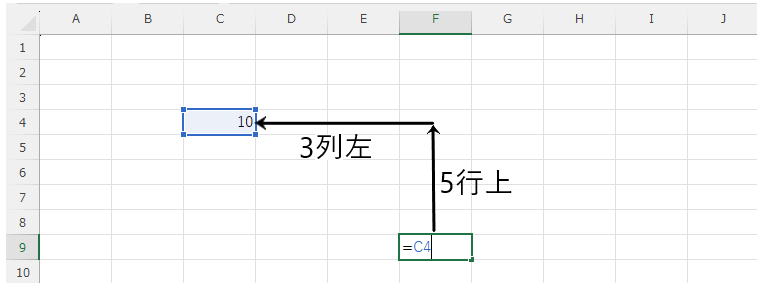 たとえば「F9セル」が「C4セル」を参照する場合、「F9セルから5行上、3列左にあるC4セルを参照する」ということです。