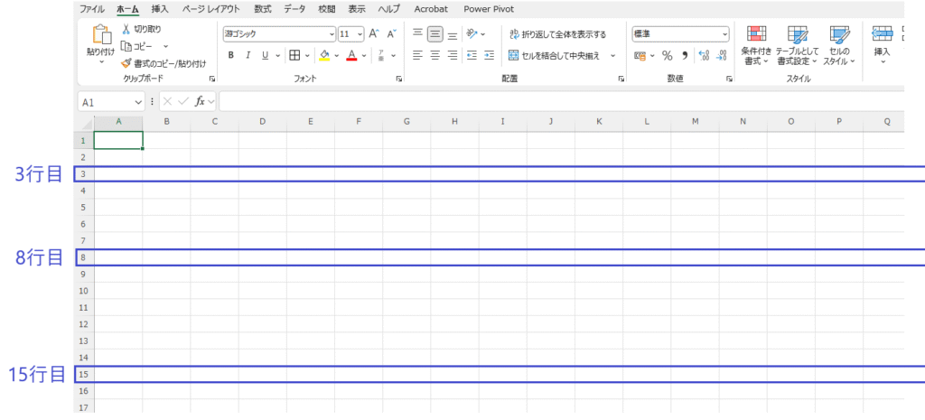 Excelの「行」(数字)のイメージは以下の図のとおりです。