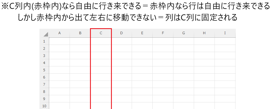 イメージ的には下図のように「C列に固定」すると「C列内では縦に行き来できるけど、左右には行き来できない」という感じです。