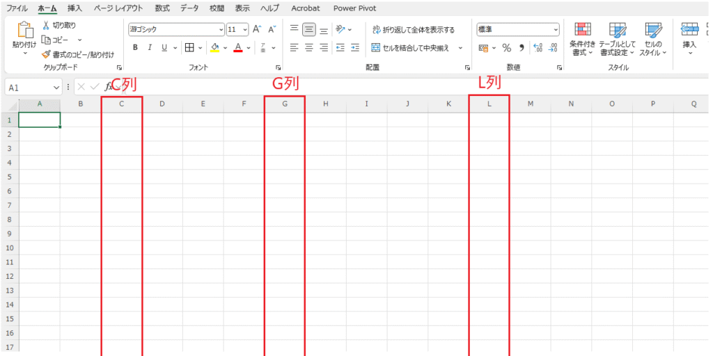 Excelの「列」(アルファベット)のイメージは以下のとおりです。