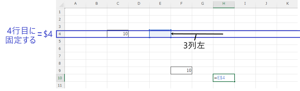 つまり「H10セル」から見て「行は必ず4行目を参照し、列は自分の位置から3列左を参照する」ので、「E4セル」を参照することになります。