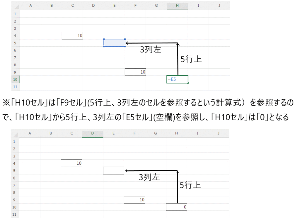この場合「H10セル」の計算式は「5行上、3列左のセルを参照する」という計算式なので、「H10セル」から5行上、3列左にある「E5セル」が参照先のセルとなります。