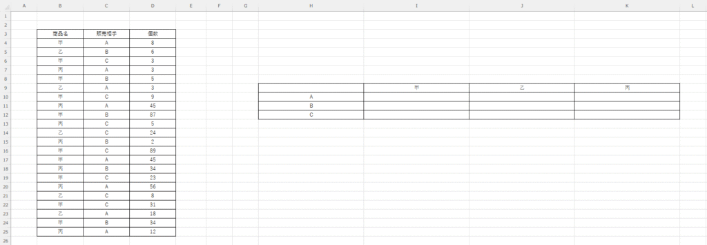そこでこの左の表をもとに、右の表で「甲商品、乙商品、丙商品をA社、B社、C社それぞれに対して何個販売したかを集計しましょうということです。