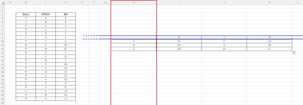 少しぼやけていますが、左の表には「商品名(甲商品、乙商品、丙商品)、販売相手(A社、B社、C社)、販売個数」が記載されています。