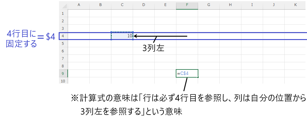 もう少し言うと「行は必ず4行目を参照するが、列は「C4セル」と「F9セル」の位置関係(「C4セル」は「F9セル」の3列左)を参照にする」ということです。