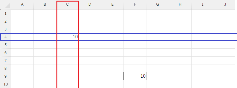 そうすると「F9セル」は「行は必ず4行目を参照し、列は自分の位置から3列左を参照する」ため「C4セル」を参照することになり、「F9セル」=「10」となります。