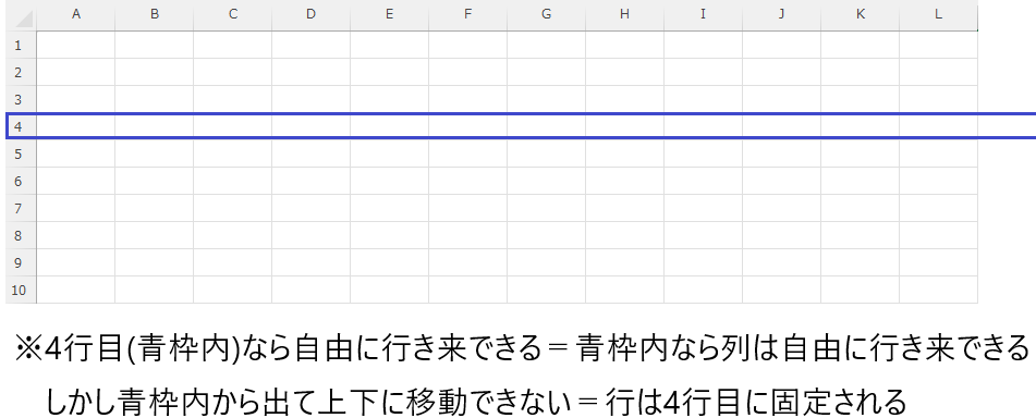 イメージ的には下図のように「4行目に固定」すると「青枠内では横に行き来できるけど、上下には行き来できない」という感じです。