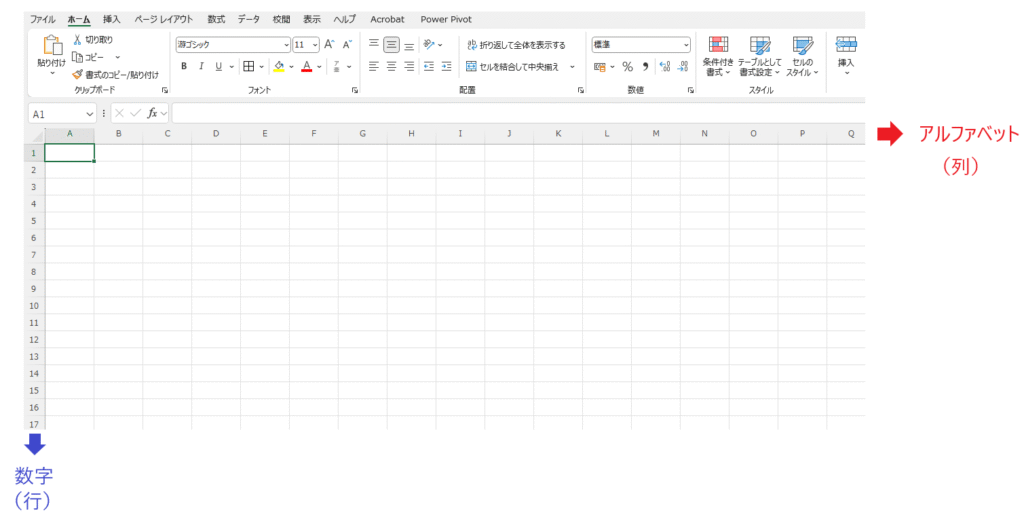 Excelは一番左に数字が、一番上にアルファベットが書かれています。そして「行」とは一番左に書かれている数字のこと、「列」とは一番上に書かれているアルファベットのことです。