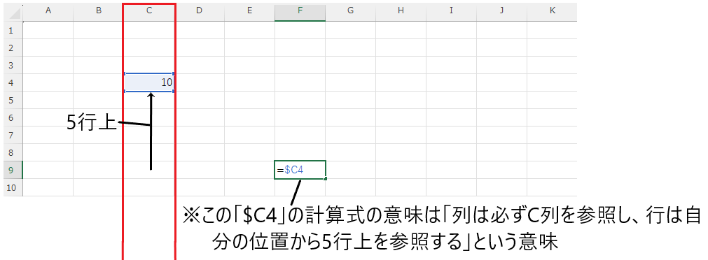 もう少し言うと「列は必ずC列を参照するが、行は「C4セル」と「F9セル」の位置関係(「C4セル」は「F9セル」の5行上)を参照にする」ということです。