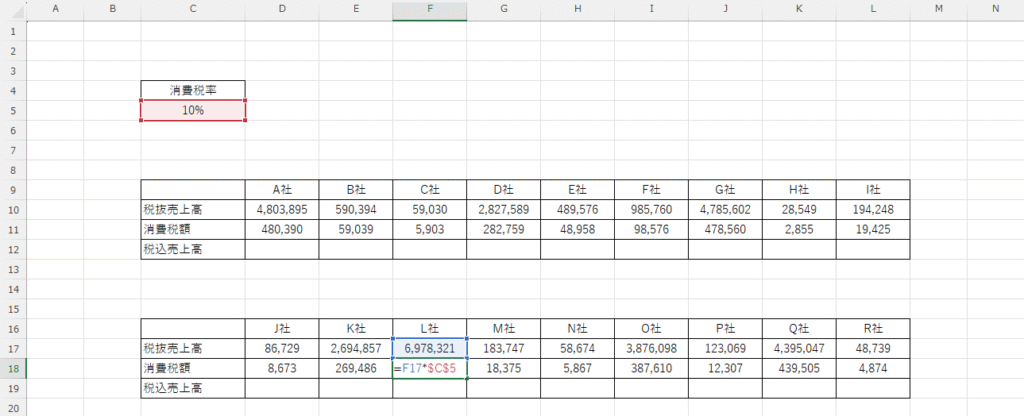 すると「F17×$C $5」という計算式が組み込まれているのが確認できます。つまりこれは「F18セルから見てひとつ上のセルの値(L社の税抜売上高)にC5セルの値(税率10%)を乗じている」ということです。