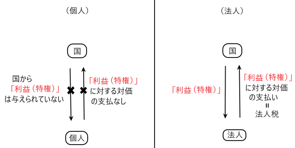 しかし、法人の場合は国から「利益(特権)」が与えられているので、その対価の支払いを行う必要があり、その対価の支払いを法人税と考えるのです。