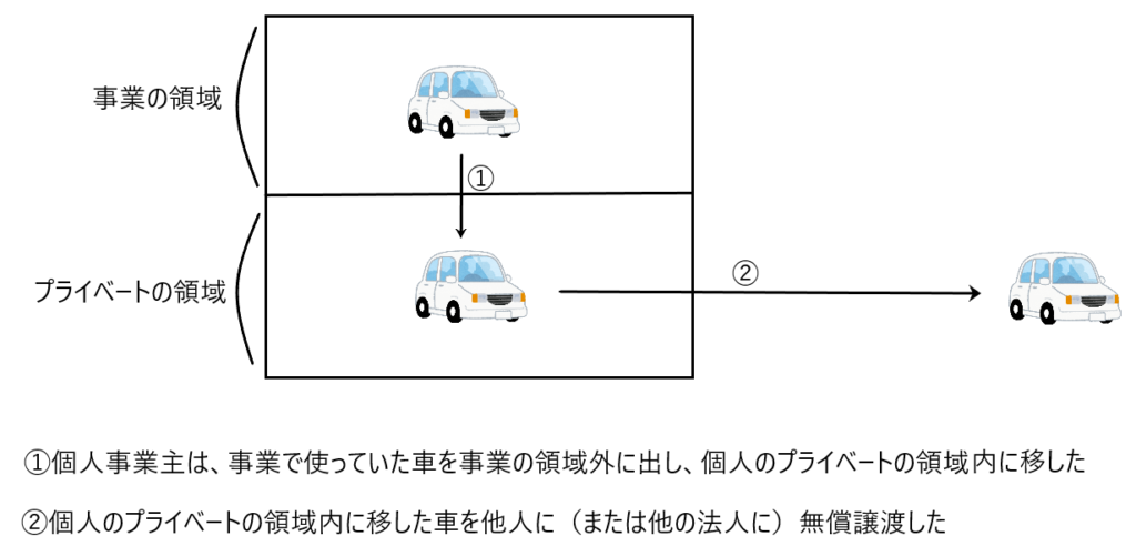 まずは「個人事業主が事業で使用していた車を無償譲渡した」という行為は以下の2つに分解できます。