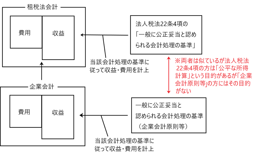 この法人税法22条4項の「一般に公正妥当と認められる会計処理の基準」≒「企業会計原則」等であるという解釈を下図を使って説明します。