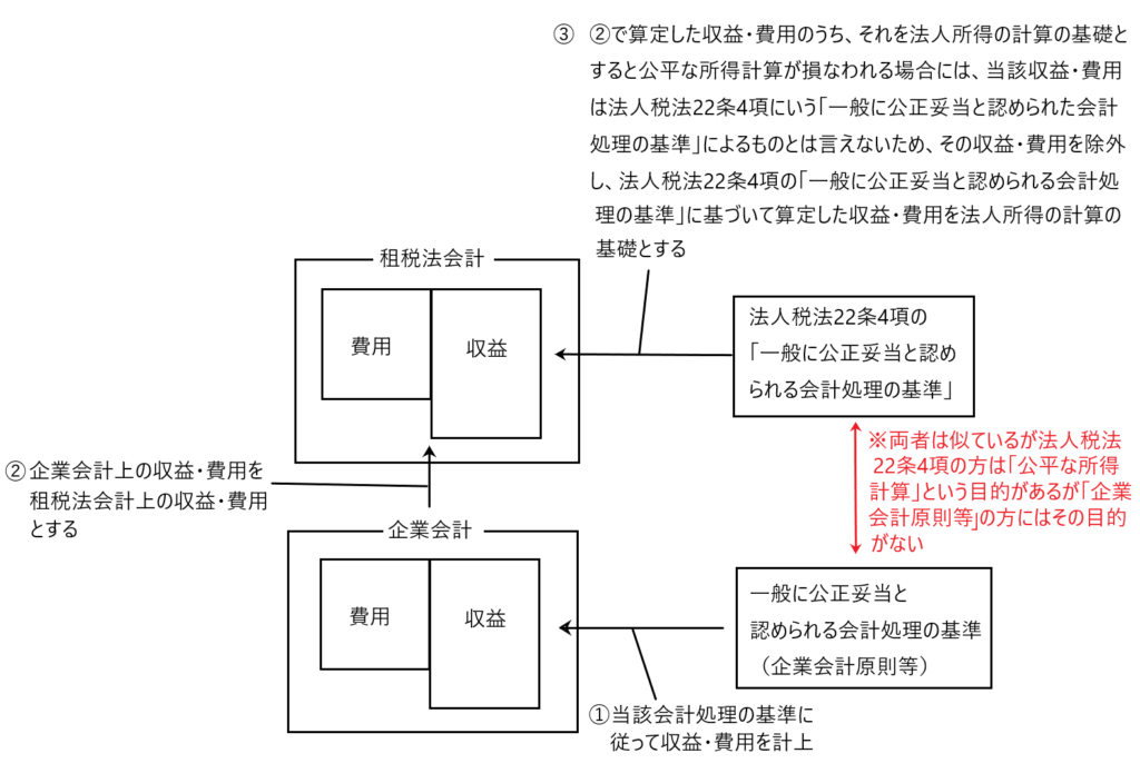 つまり、「法人所得の計算の基礎となる収益・費用は、原則として企業会計原則等に基づいて算定されるべきものであるが、企業会計原則等に従って算定された収益・費用が公平な所得計算という要請に反する場合には、その算定結果をそのまま用いるのではなく、法人税法の目的である公平な所得計算を実現できる会計処理基準によって算定された収益・費用(法人税法22条4項の「一般に公正妥当と認められた会計処理の基準に従って算定した収益・費用)を、法人所得計算の基礎とすべき」ということです。