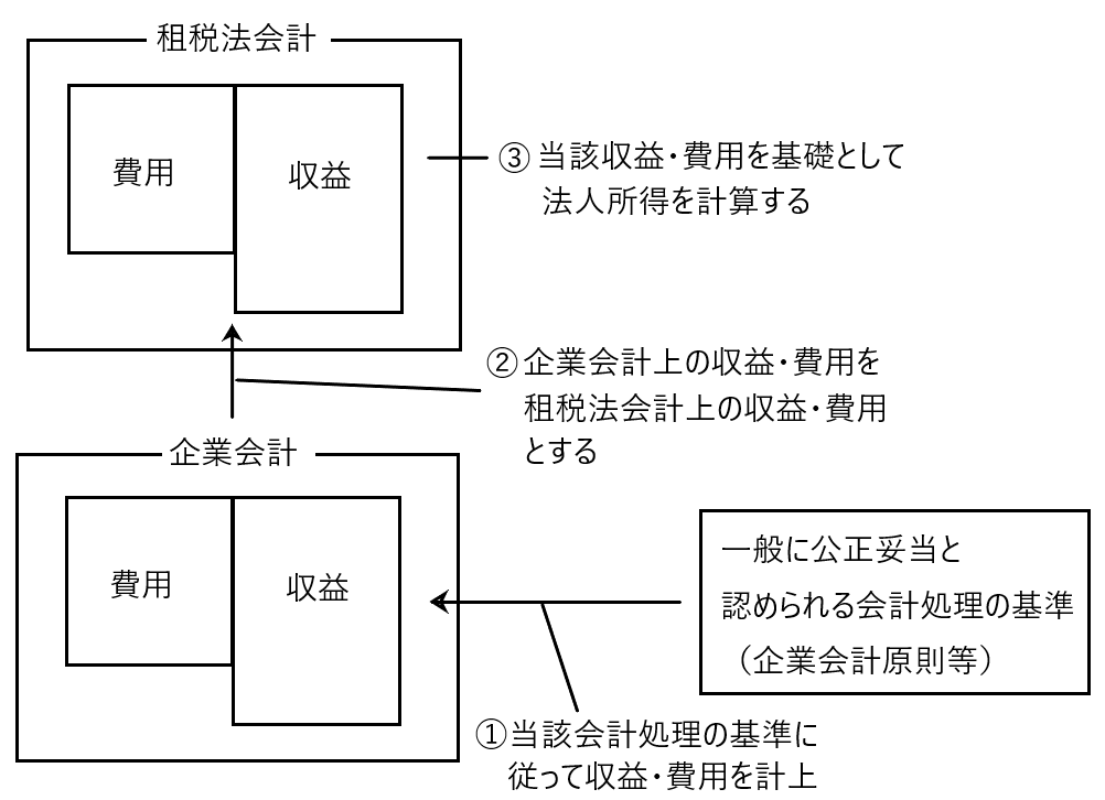 よって「企業会計原則等」にしたがって計算された収益・費用は、企業会計上の収益・費用にも租税法会計上の法人所得を計算するための基礎となる収益・費用にもなります。