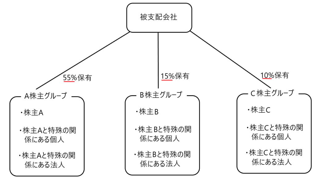 A株主グループは、株主A、株主Aと特殊の関係にある個人、株主Aと特殊の関係にある法人が有する株式の合計が55%であるので、「1つの株主グループで発行済株式等の50%超を有する場合」に該当し、被支配会社になります。