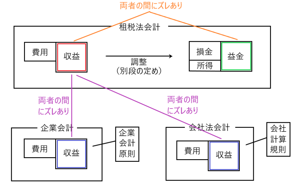 この□は企業会計原則などに従って計算された収益(□)との間にズレがあり、かつ当然に別段の定めにより調整された後の益金(□)ともズレがあることになります(下図参照)。