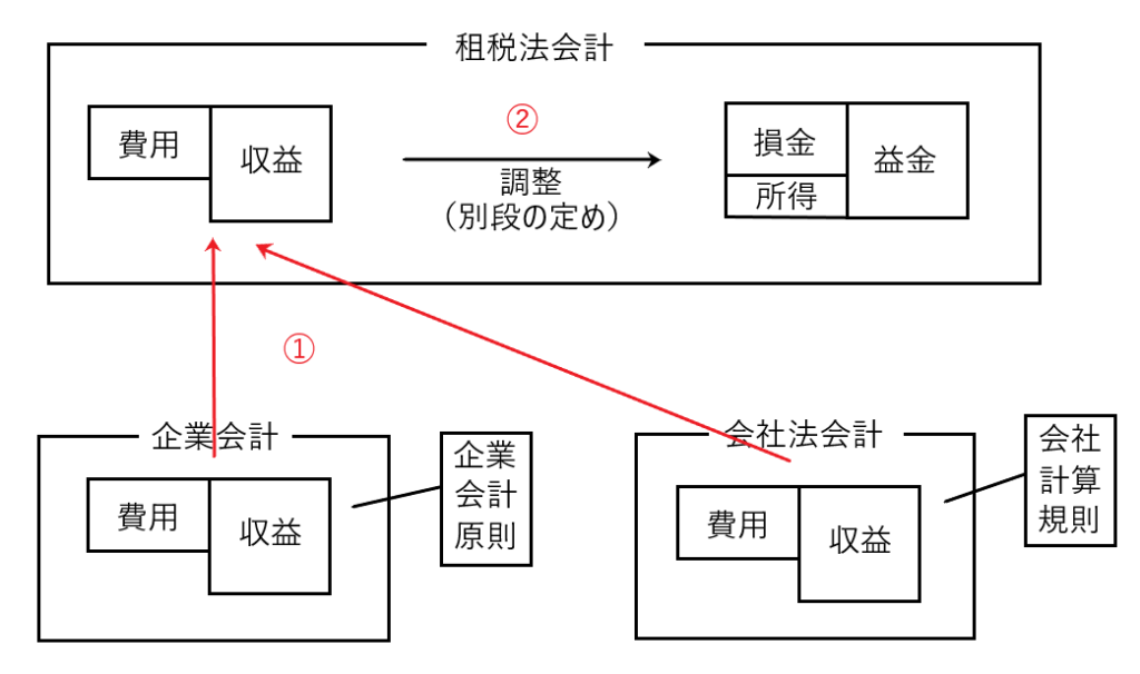 つまり①企業会計原則などに従って計算した収益・費用を法人所得を求めるための基礎とし、②当該収益・費用に「別段の定め」による修正を加えて益金・損金を求めるという流れになります。