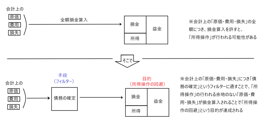 もっと言うと、「会計上の原価・費用・損失」の全てにつき損金算入を許すと、所得操作が行われる可能性があるから、これを回避するために「債務の確定」という手段(フィルター)を用意し、このフィルターに「会計上の原価・費用・損失」を通すことで、所得操作が行われる余地のない「原価・費用・損失」(つまり法人税法22条3項の原価・費用・損失)のみが損金算入されるのです。