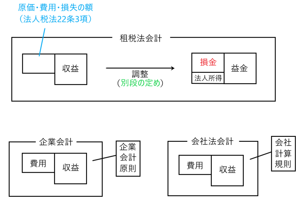 上記でも説明しましたが、法人税法22条3項に規定されている「原価・費用・損失の額」は「別段の定め」による調整前の額です。