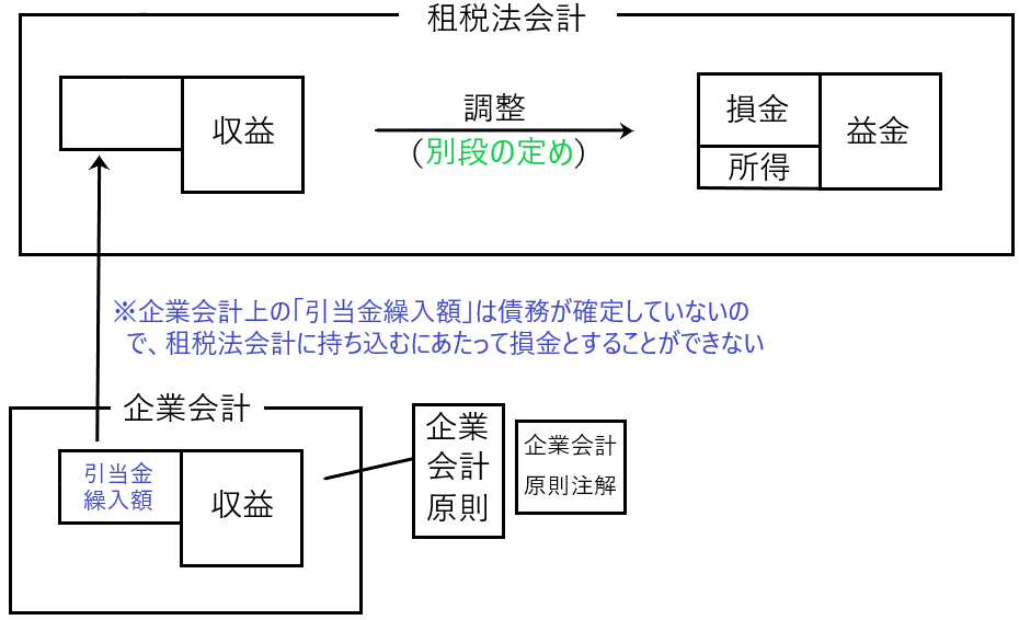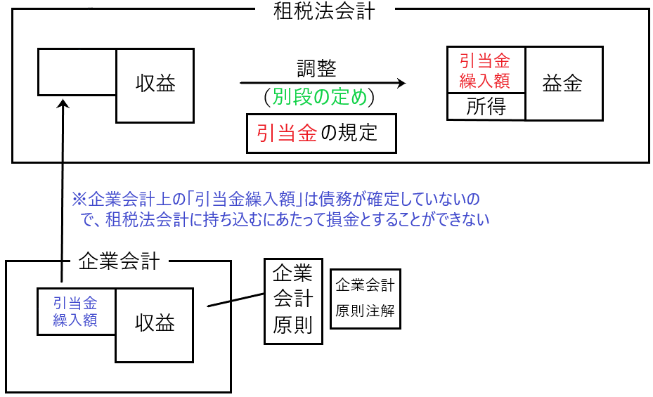 つまり流れ的には「企業会計上計上された引当金繰入額は債務の確定しない費用なので、一旦その全てにつき損金算入が否定されますが、別段の定めにおいて規定されている引当金については当該引当金繰入額につき、損金算入が認められる」ということです。