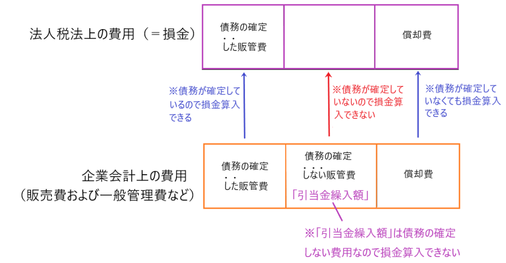 そして「債務の確定した販管費・償却費」は損金算入が認められますが、「債務の確定しない販管費(引当金繰入額はここに含まれる)」は損金算入が認められません。