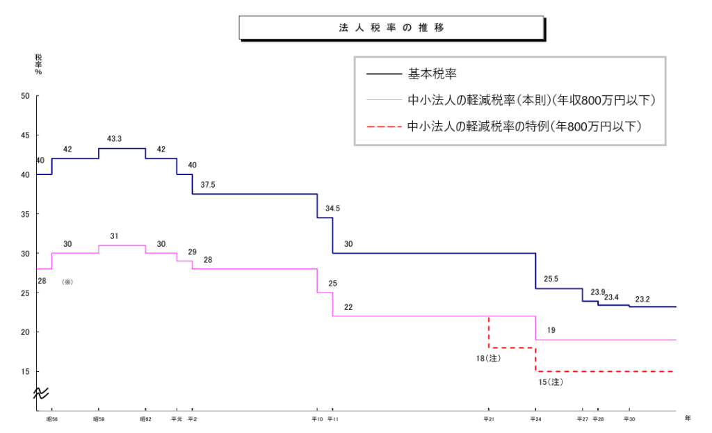 グラフで見るように、昔は43,3%もあった法人税率が、今では23.2%まで下がっています。