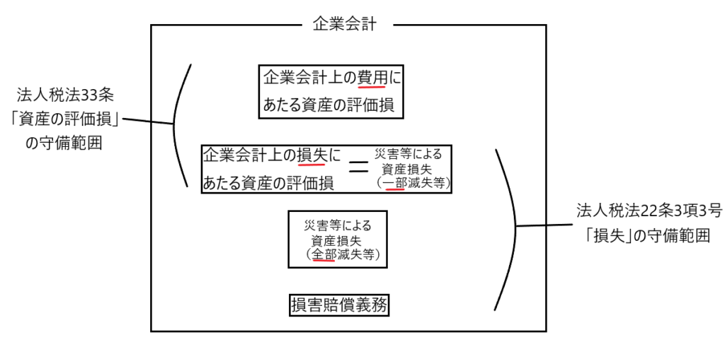 このように「企業会計上の損失にあたる資産の評価損=災害等による資産損失(一部滅失等)」につき、法人税法33条と22条3項3号の守備範囲が重なることになります。