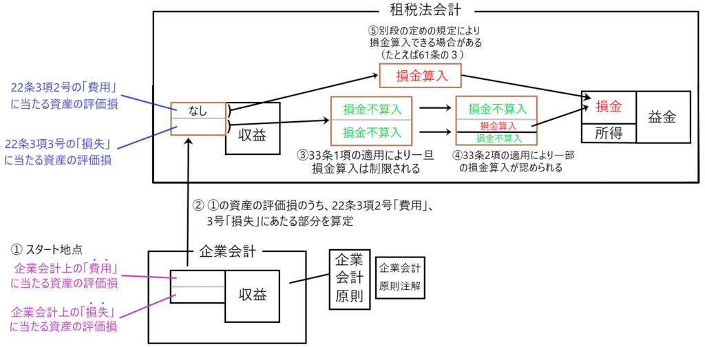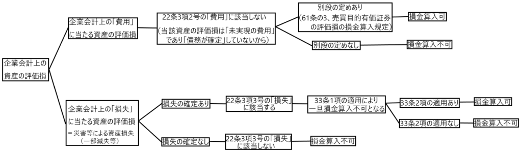 したがって、③の段階で損金不算入とされた22条3項3号の「損失」(資産の評価損)のうち、33条2項の要件を満たすものは損金算入が認められ、33条2項の要件を満たさないものは、損金算入が認められません。