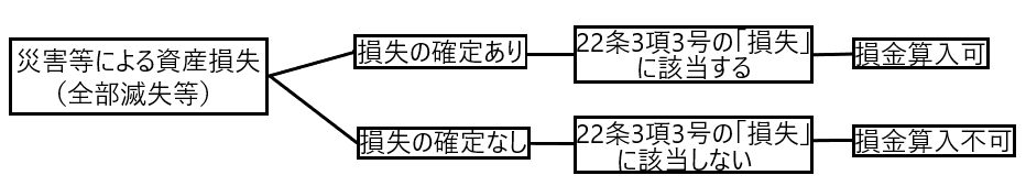「災害等による資産損失(全部滅失等)」について、その損失が「客観的に確定」しているときは、損失が確定しているので、22条3項3号の「損失」にあたり損金算入が認められます。