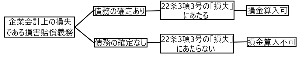 よって「企業会計上の損失にあたる損害賠償義務」のうち、債務の確定しているものは22条3項3号の「損失」に該当し損金算入が認められますが、「企業会計上の損失にあたる損害賠償義務」のうち、債務の確定していないものは22条3項3号の「損失」に該当せず、損金算入が認められません。