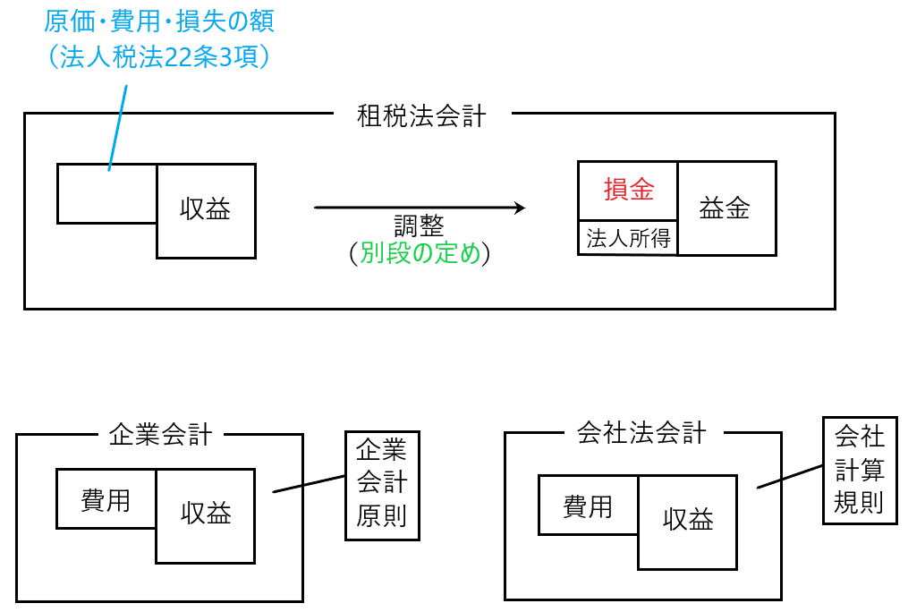 法人税22条3項を簡単に言い直すと、「損金の額は別段の定めがあるものを除き、原価・費用・損失の額とする」ということになります。