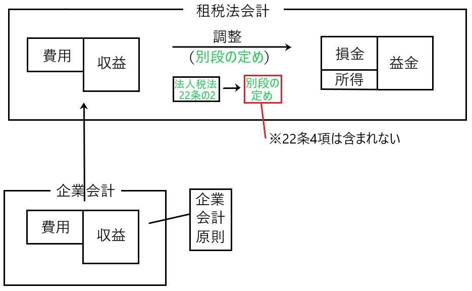 つまり図の□の別段の定めの中に、22条4項は含まれず、法人税法22条の2は22条4項によって上書きされることはない、と規定しているのです。