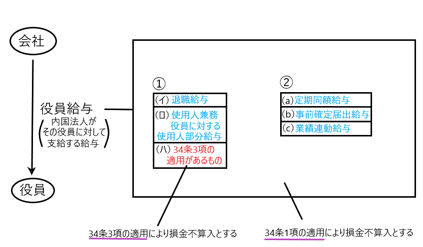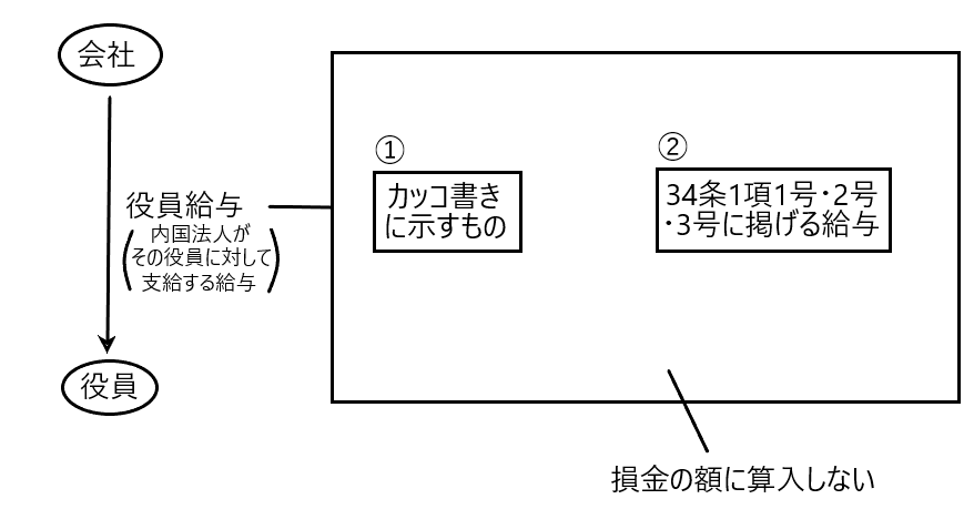 34条1項を簡単に書き直すと、「内国法人がその役員に対して支給する給与(①『カッコ書きに示すもの』を除く)のうち、②『34条1項1号・2号・3号に掲げる給与』のいずれにも該当しないものについては、損金の額に算入しない」ということになります。