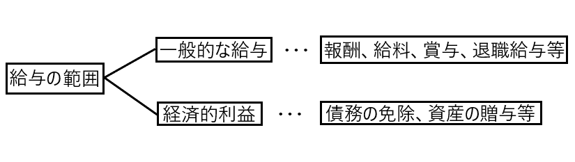 法人税法においては、一般的に給与とされる報酬・給料・賞与・退職給与等のほか、債務免除や資産の贈与その他の経済的利益のように、実質的に役員や従業員に対して給付したのと同様の経済的効果があるものは、給与の範囲に含めて取り扱います。