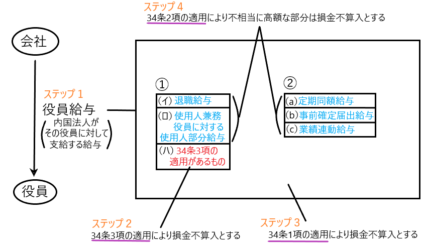 少し付け加えると、29年度改正後は「業績に連動する役員退職給与」と「業績に連動しない役員退職給与」が法的に分類され、前者は34条1項3号の要件を満たさない限り34条1項の適用により損金算入は認められず(要件を満たす場合は34条1項によっては損金不算入とならずに、34条2項により不相当に高額な部分があれば、その部分につき損金不算入となる)、後者は34条1項のカッコ書の「退職給与で業績連動給与に該当しないもの」にあたり、34条1項の規定によっては損金算入は否定されず、34条2項により不相当に高額な部分があれば、その部分につき損金不算入となります。