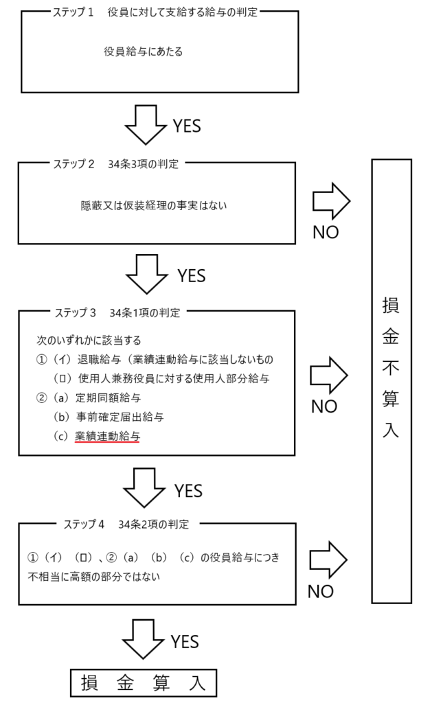 34条3項の適用がなければ、次に34条1項の適用があるか否かを判定します。①(イ)(ロ)、②(a)(b)(c)に該当する役員給与であるなら、34条1項の損金不算入規定の適用は受けないことになります。業績連動給与は②(c)にあたるため、34条1項によっては損金不算入とはなりません。
