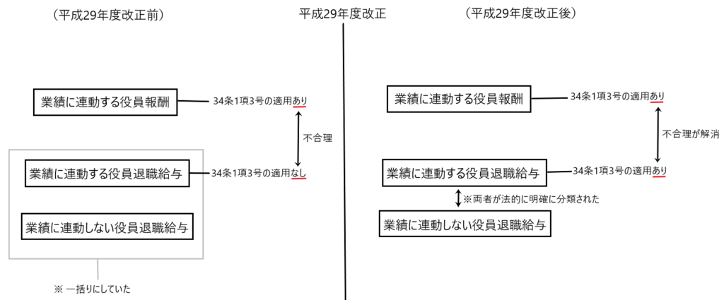 つまり平成29年度改正前は同じ業績に連動する給与でも、かたや「業績に連動する役員報酬」の場合は34条1項3号が適用され、同号の要件を満たさなければ損金算入は認められず、かたや「業績に連動する役員退職給与」は34条1項3号の適用はなく、同号の要件を満たさなくても(34条2項をクリアすれば)損金算入が可能という不合理がありました。しかし平成29年度の改正により「業績に連動する役員退職給与」も34条1項3号が適用され、同号の要件を満たさなければ損金算入が認められなくなり、両者の不合理が解消されたということです。