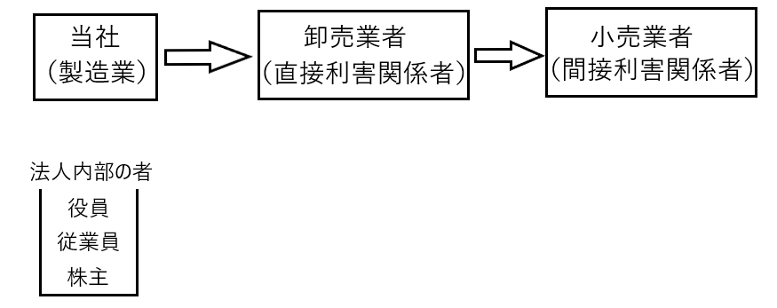 たとえば、当社が製造業を営んでいた場合、直接利害関係者である卸売業者、間接利害関係者である小売業者、そして当社の内部の者である役員、従業員、株主が「特定の者」となります。