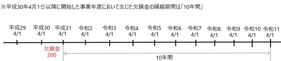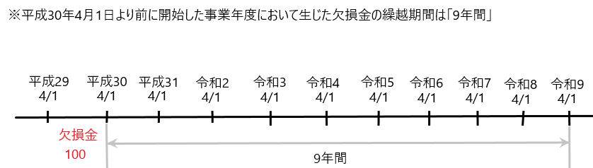 「平成30年4月1日より前に開始した事業年度において生じた欠損金の繰越期間は『9年間』」、「平成30年4月1日以降に開始した事業年度において生じた欠損金の繰越期間は『10年間』」となります。