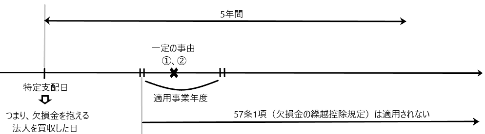 欠損法人等が、他の者との間に当該他の者による特定支配関係を有することとなった日(特定支配日)以後5年を経過した日の前日等までに、一定の事由(下記➀、➁等)に該当する場合には、その該当することとなった日の属する事業年度(適用事業年度)以後の各事業年度において、57条1項(欠損金の繰越控除規定)は適用されないことになります(57条の2、施行令113条の3)。