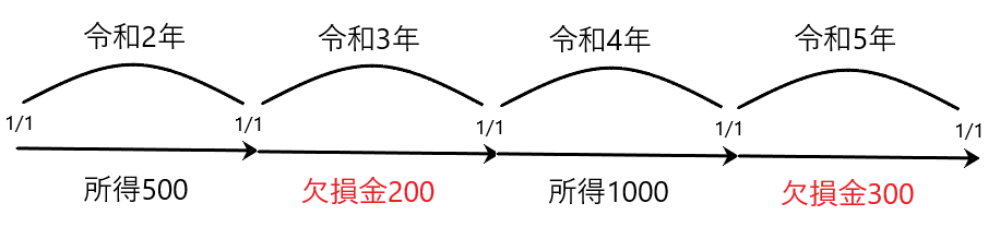 上の例において、もしも2年間が1事業年度であるならば、令和2年と3年の法人所得は「500-200=300」、令和4年と5年の法人所得は「1000-300=700」です。