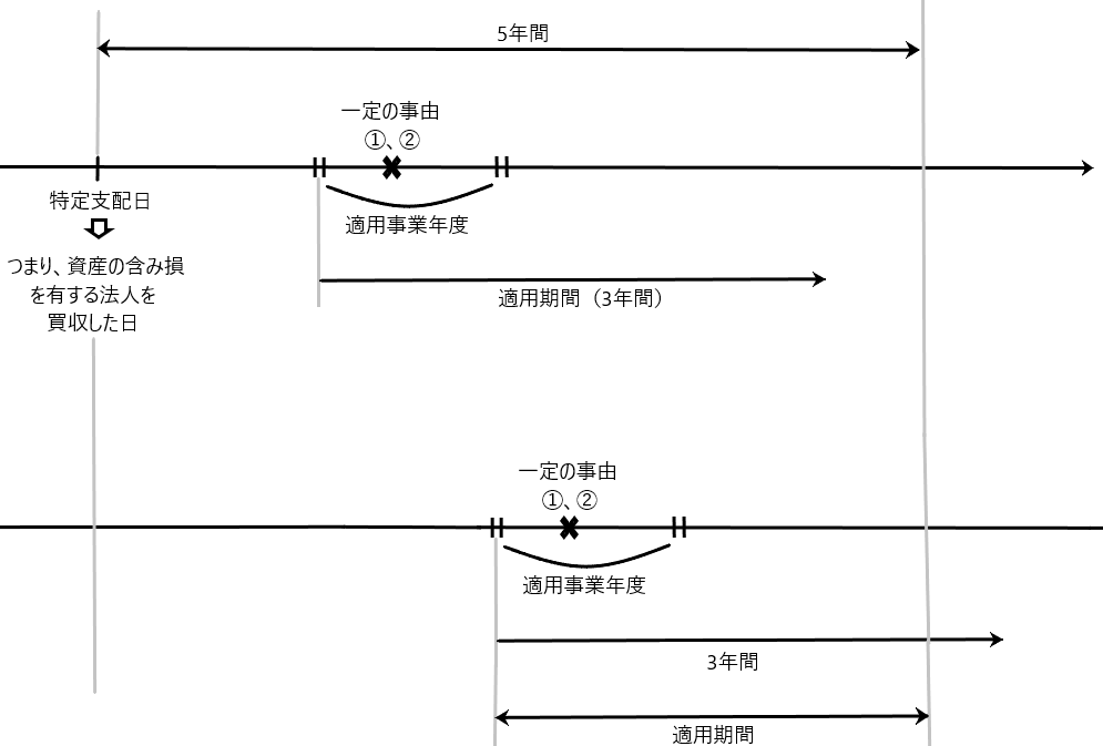 上記の「適用期間」とは、欠損等法人の適用事業年度開始の日から同日以後3年を経過する日までの期間とされています(60条の3第1項)。ただし、その3年を経過する日が、欠損等法人において特定支配関係を有することとなった日(特定支配日)以後5年を経過する日よりも後の日となる場合は、その5年を経過する日までとされています。