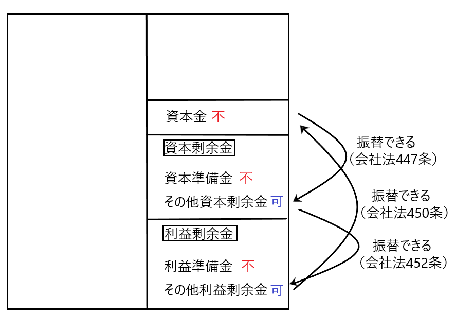 「資本剰余金からその他利益剰余金」に振替えることができます(会社法452条)。この規定により処分可能額であるその他利益剰余金に「原資」を振替ることが可能となります。つまり、①まずは会社法447条により資本金からその他資本剰余金へ振替えることにより、原資をその他資本剰余金に振替え、その後➁会社法452条によりその他資本剰余金をその他利益剰余金に振替えることで、原資をその他利益剰余金に振替えることができるのです。会社法上、その他利益剰余金を配当に回すことができるので(会社法461条)、➀と➁によりその他利益剰余金に振替えられた「原資」を配当に回すことが可能です。