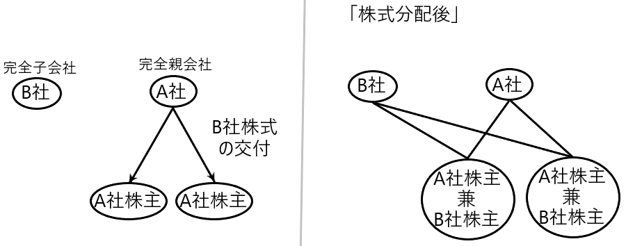株式分配とは、たとえば完全親会社A社が完全子会社B社の株式を、A社の株主に全て分配することをいいます。