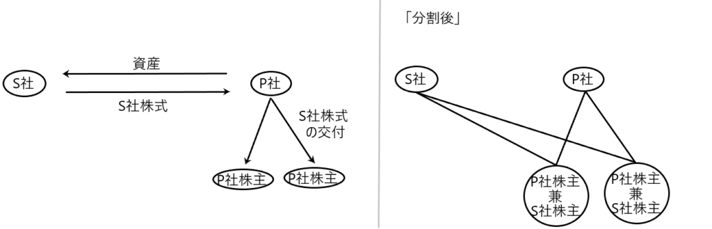 分割型分割とは、たとえばP社が資産を出資してS社を作り、P社が取得したS社株式をP社株主に交付するものです。